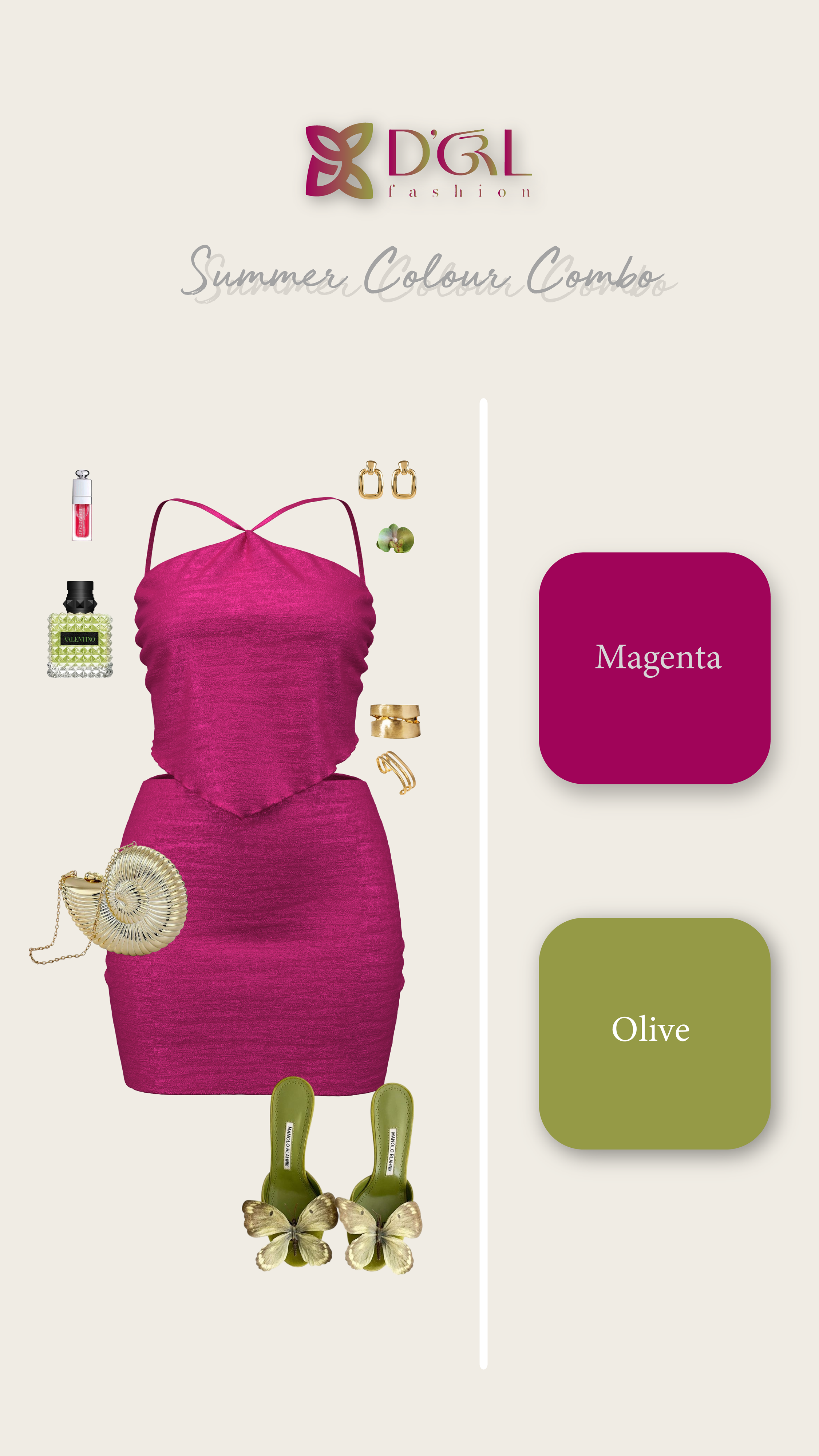Shop NowMake a bold summer statement in this magenta bodycon dress, styled with olive butterfly heels, gold accessories, a seashell bag, and glossy lips—perfect for beach parties, brunches, and tropical holiday fashion.