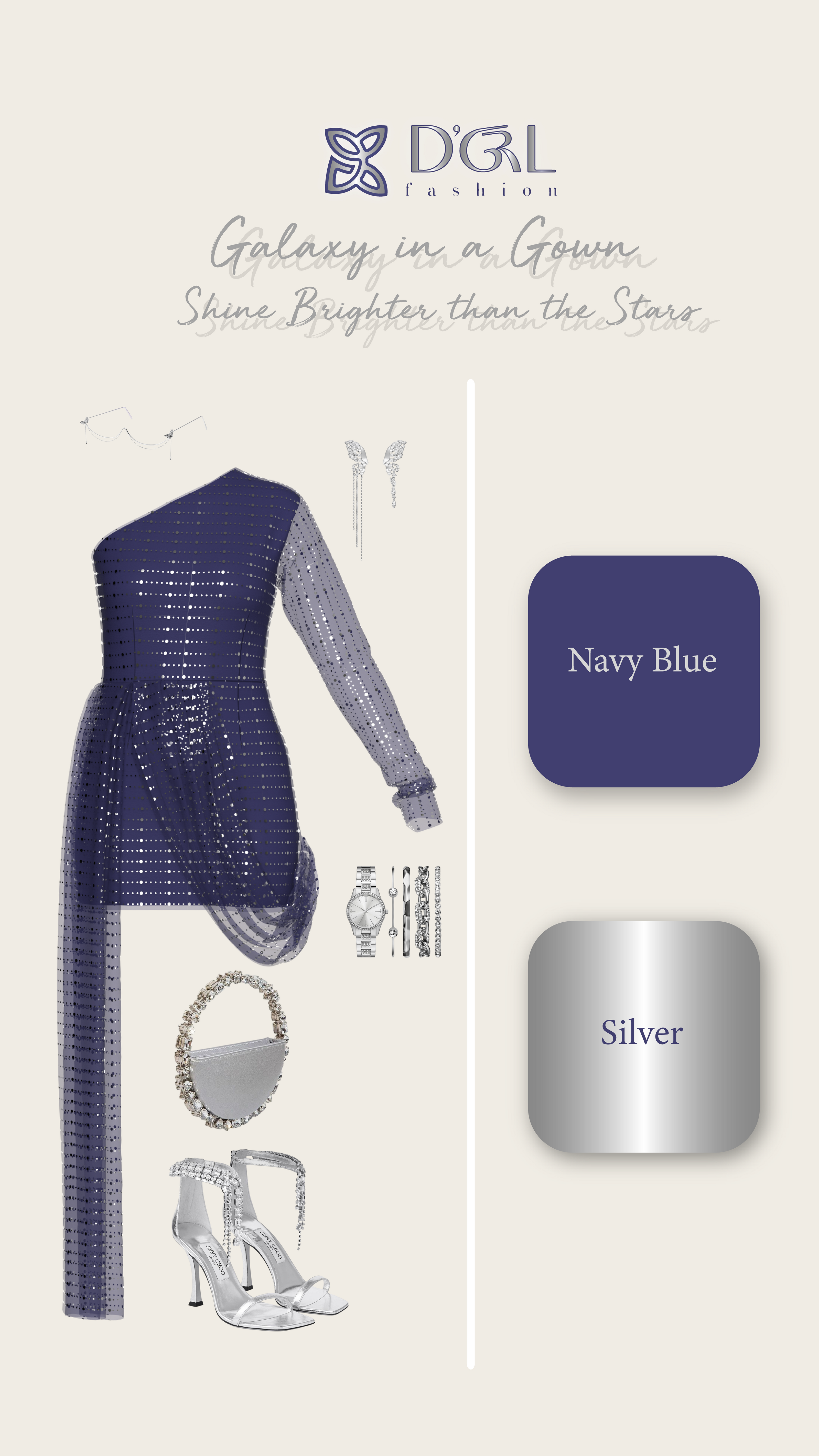 Shop NowShine like a star in this navy blue one-shoulder sequin gown, styled with silver heels, shimmer clutch, layered bracelets, drop earrings, and a sleek silver watch—perfect for glamorous winter parties, evening galas, and premium festive wear.