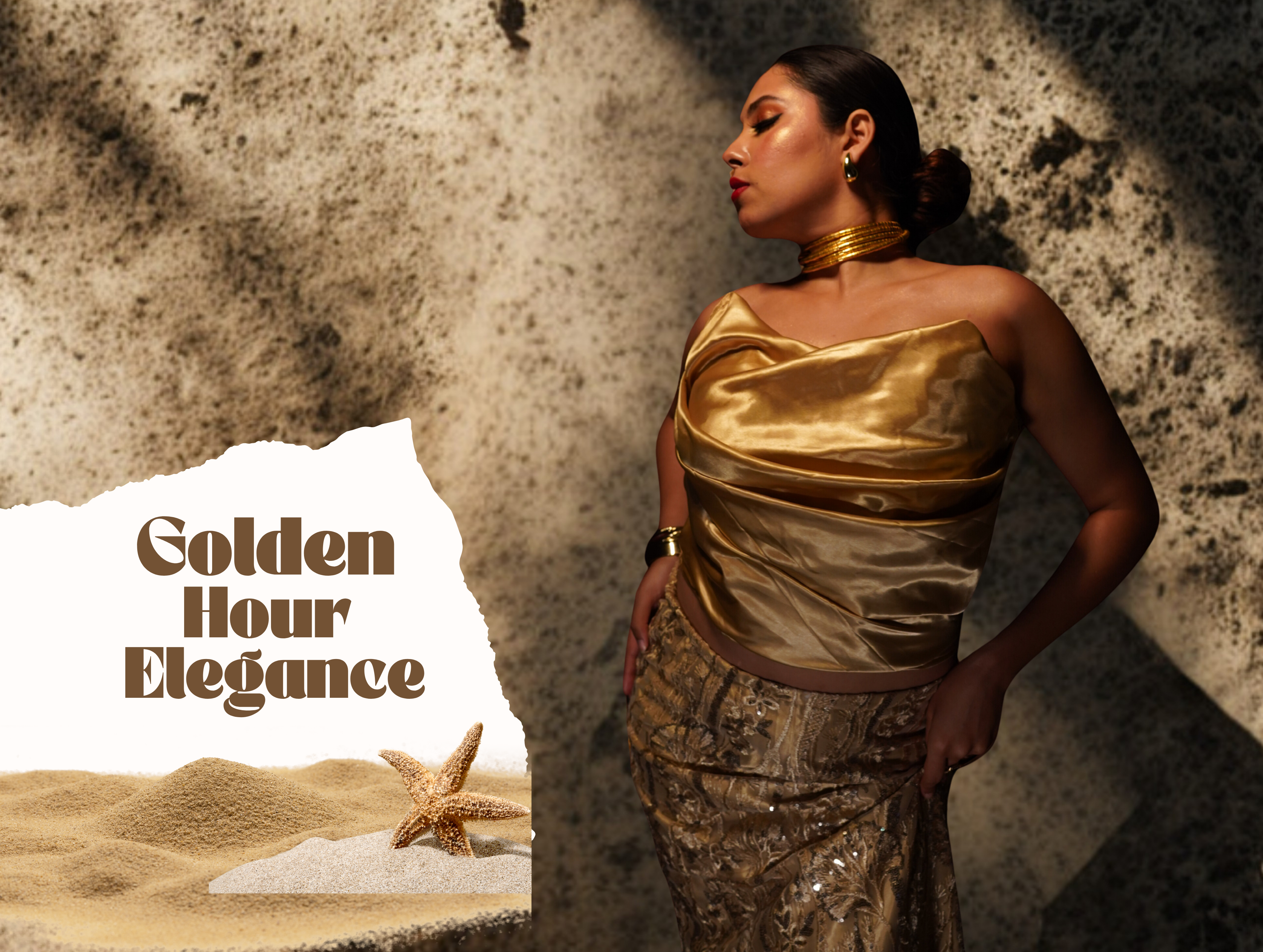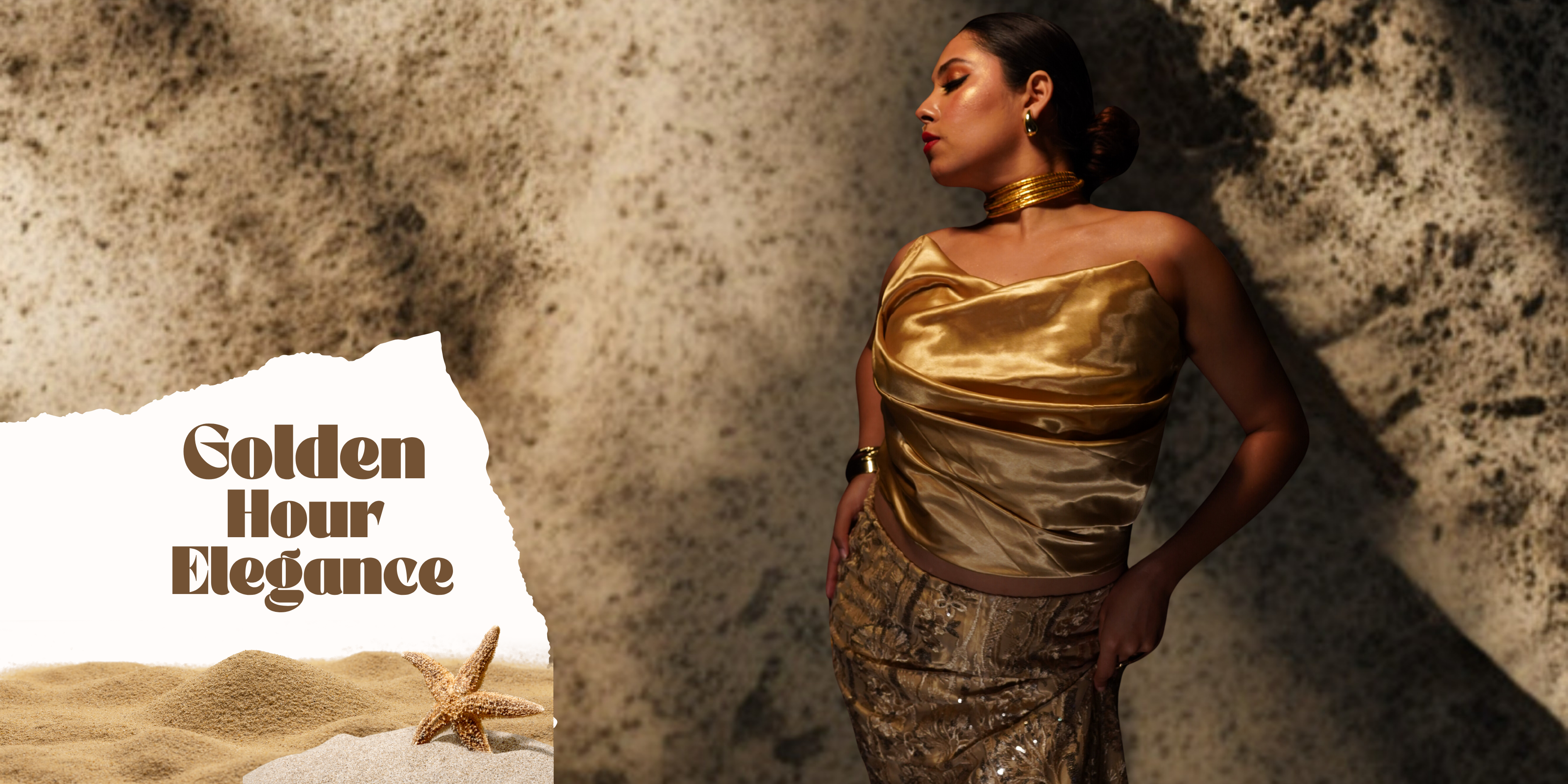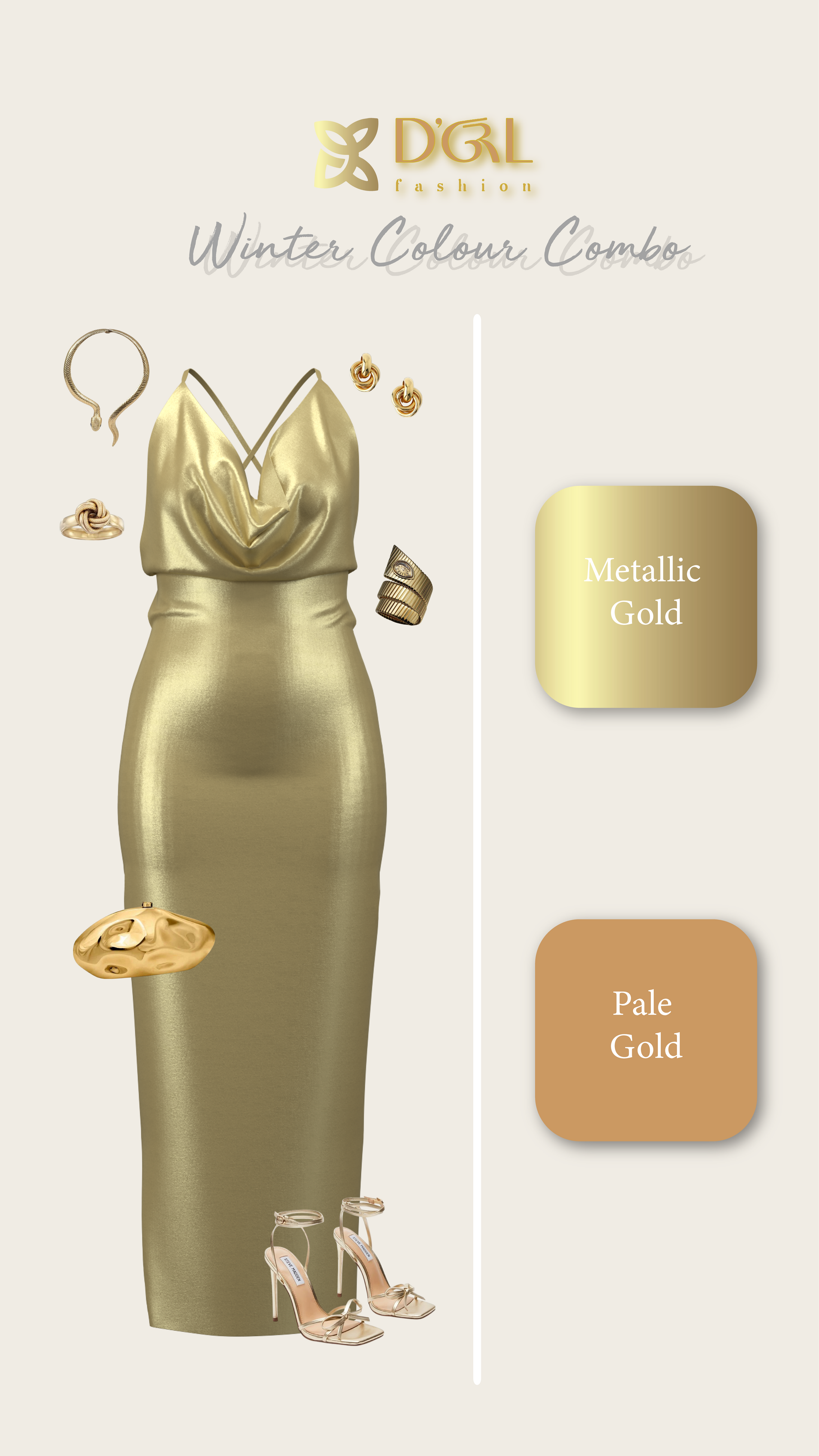 Shop NowShimmer in this metallic gold cowl-neck dress, styled with a statement gold necklace, classic watch, knot earrings, bold rings, cuff bracelet, and pale gold heels—perfect for winter parties and premium evening wear.