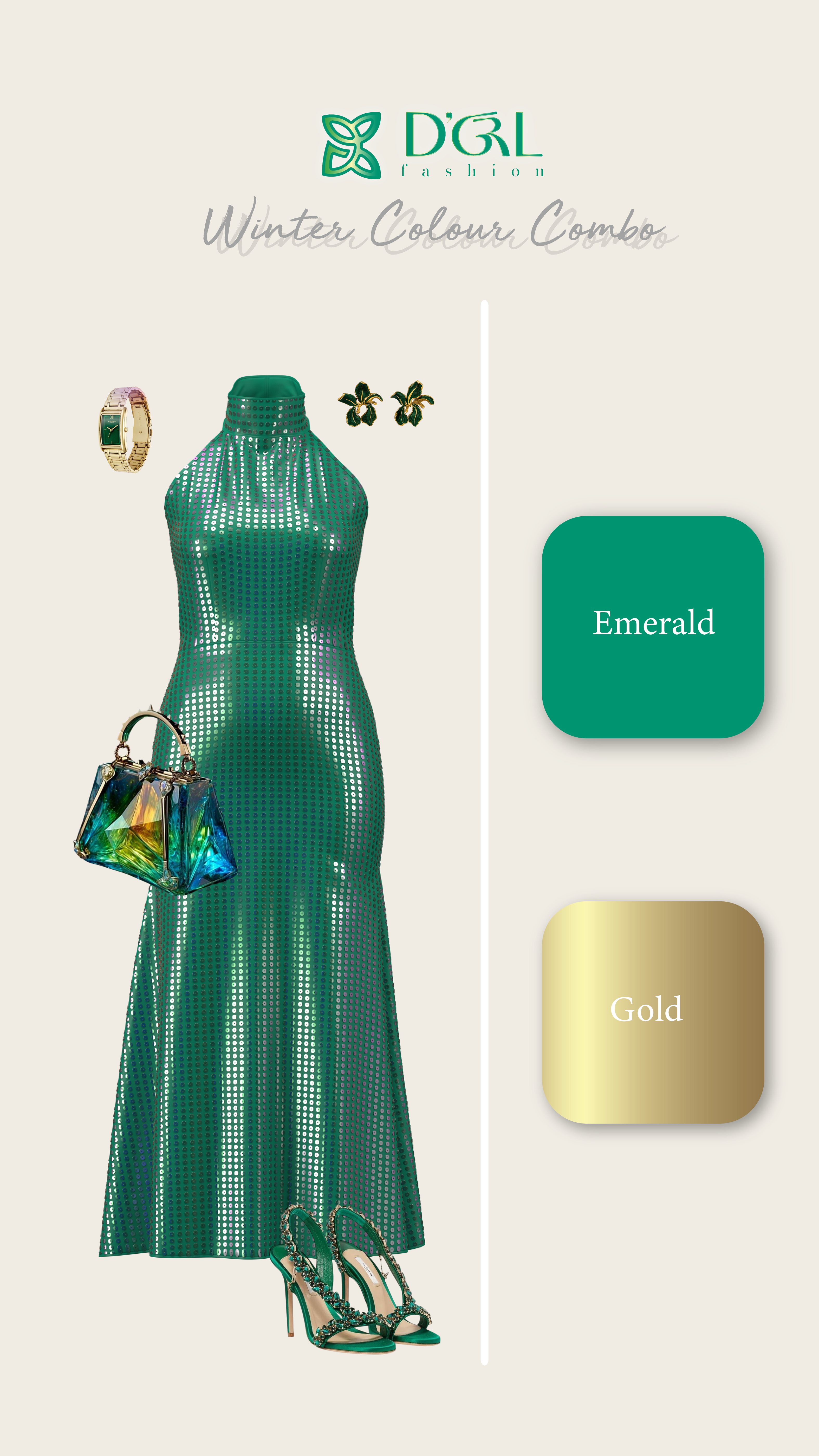 Shop NowTurn heads in this stunning emerald green sequin gown, paired with a golden watch, floral earrings, holographic statement bag, and embellished heels—perfect for winter weddings, festive soirées, and premium evening wear.