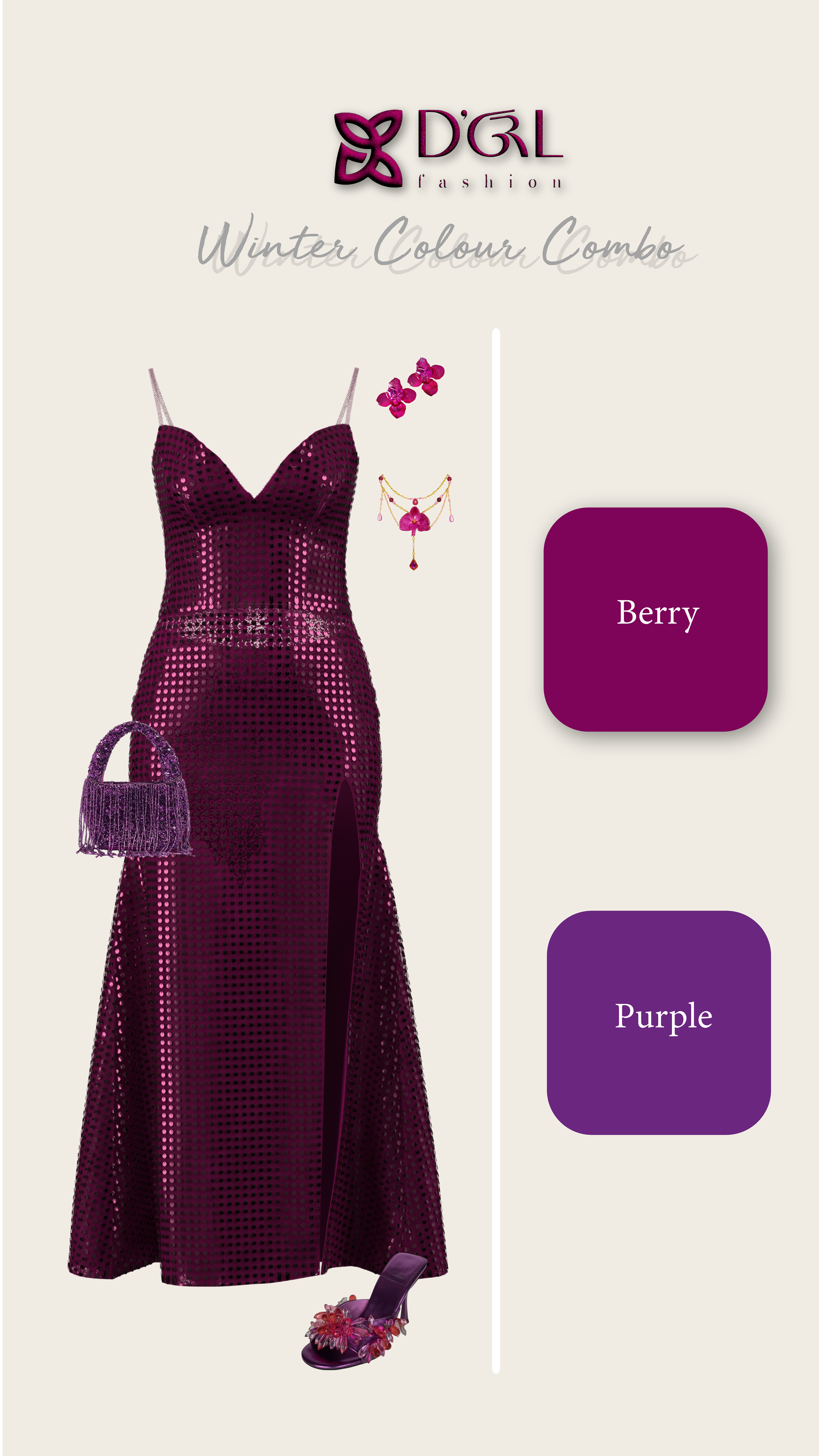 Shop NowDrape yourself in elegance with this berry-toned sequin gown featuring a thigh-high slit, styled with floral earrings, a statement neckpiece, purple fringe bag, and embellished heels—ideal for winter weddings, cocktail nights, and premium party wear.