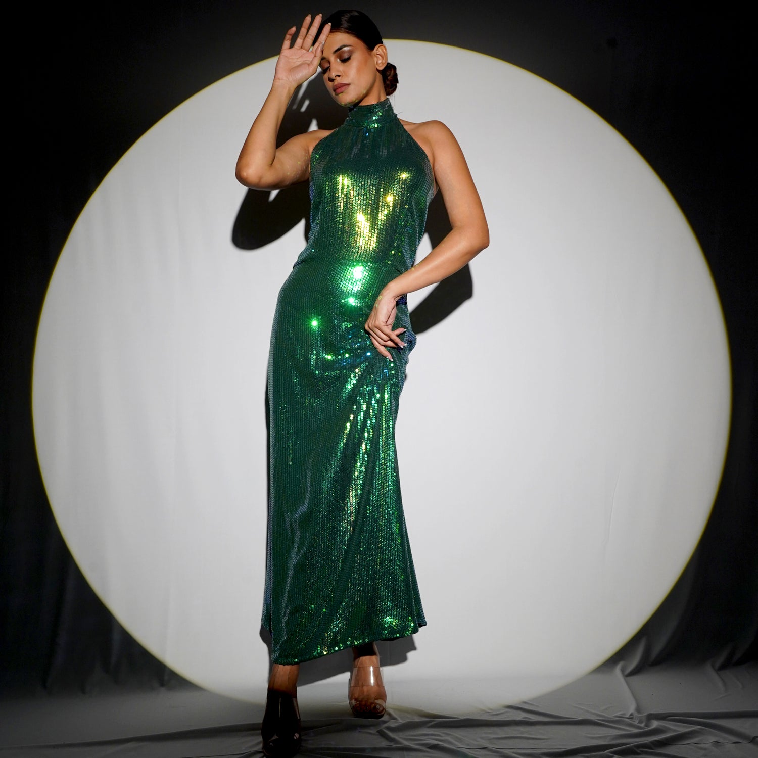 Emerald Elegance: Sequin Gown with Gold Luxe Accents