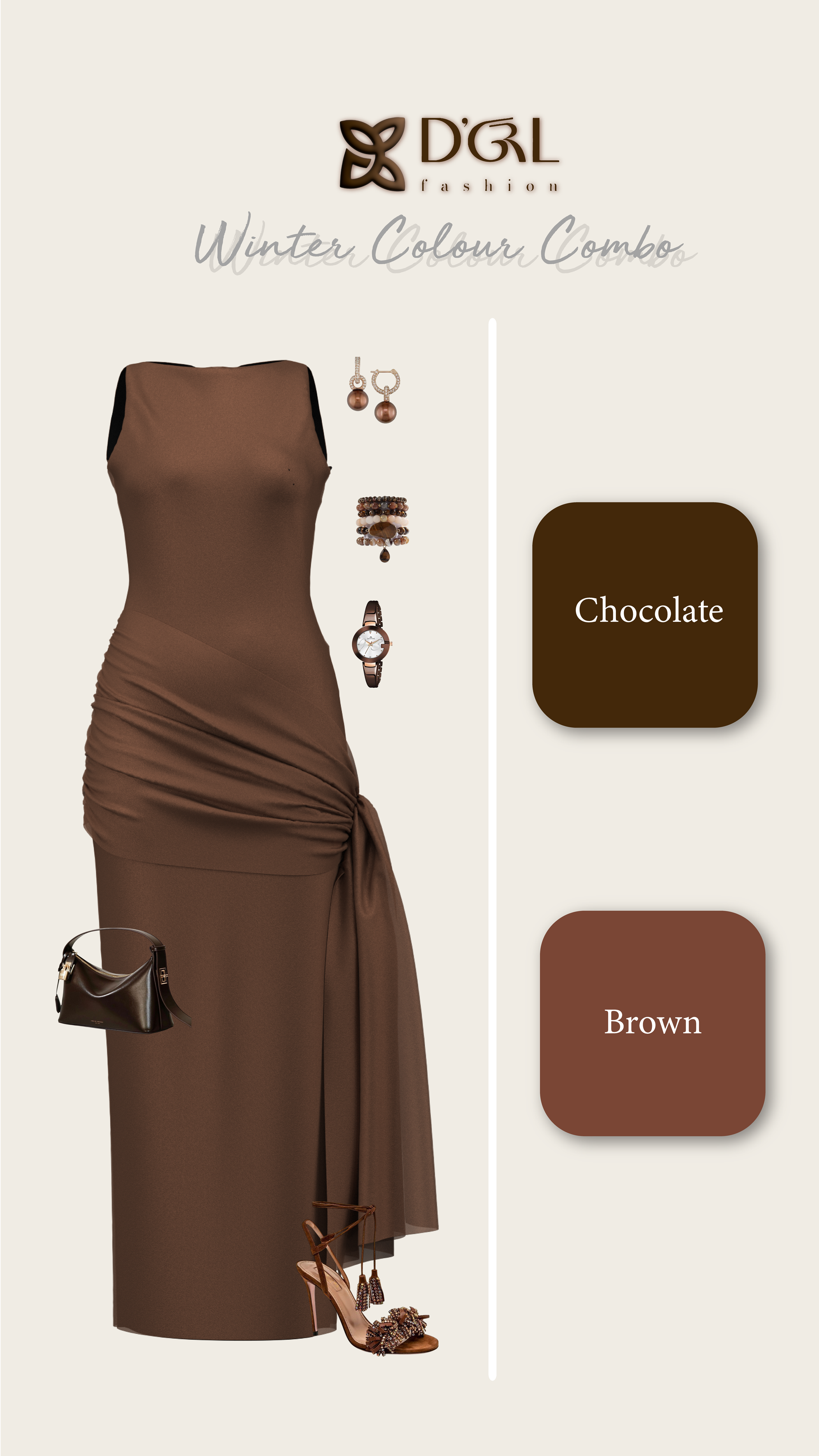 Shop NowElevate your winter style with this chocolate brown wrap gown styled with tassel heels, beaded bracelets, rose gold watch, and matching brown accessories—perfect for formal western dress for winter weddings